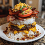 The Bacon Cheeseburger Rice Stack is a bold, satisfying dish that brings together everything people love about a classic cheeseburger and turns it into a hearty, layered meal. Juicy seasoned beef, crispy bacon, melted cheese, and fluffy rice are stacked together to create a comforting dish that feels familiar yet exciting. I first made this recipe when I wanted something more filling than a standard burger but still packed with the same flavors. The rice adds structure and makes the dish perfect for serving as a plated meal rather than a handheld sandwich. It is rich, savory, and incredibly filling, making it ideal for family dinners or casual gatherings. This recipe is straightforward, customizable, and guaranteed to please anyone who enjoys comfort food with bold flavors.