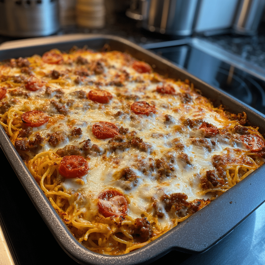 A layered pasta bake combining creamy spaghetti and savory meat sauce topped with melted cheese.