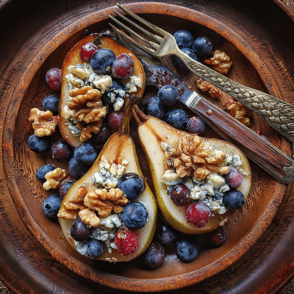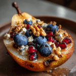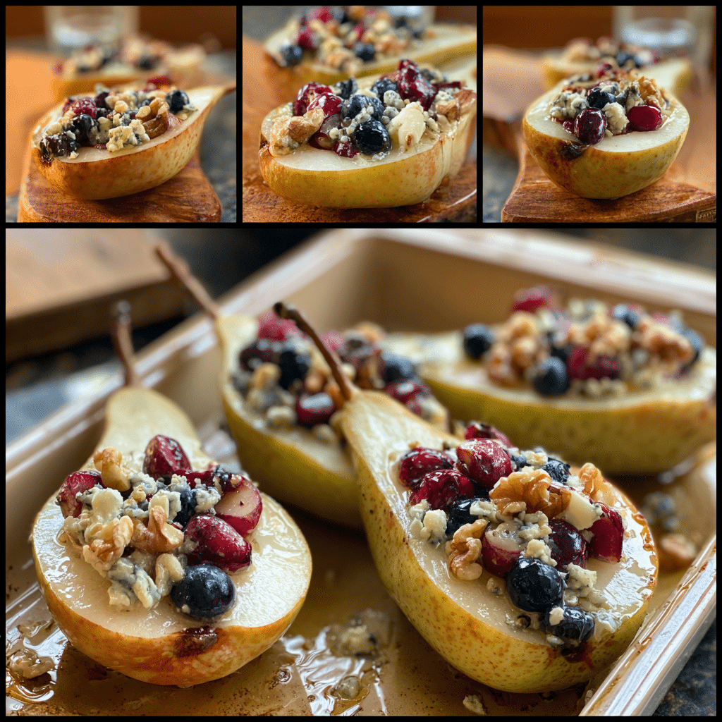 Baked Pears with Berries, Honey, Walnuts & Blue Cheese is an elegant sweet-and-savory dish featuring tender roasted pears filled with juicy berries, crunchy walnuts, creamy blue cheese, and a drizzle of golden honey.