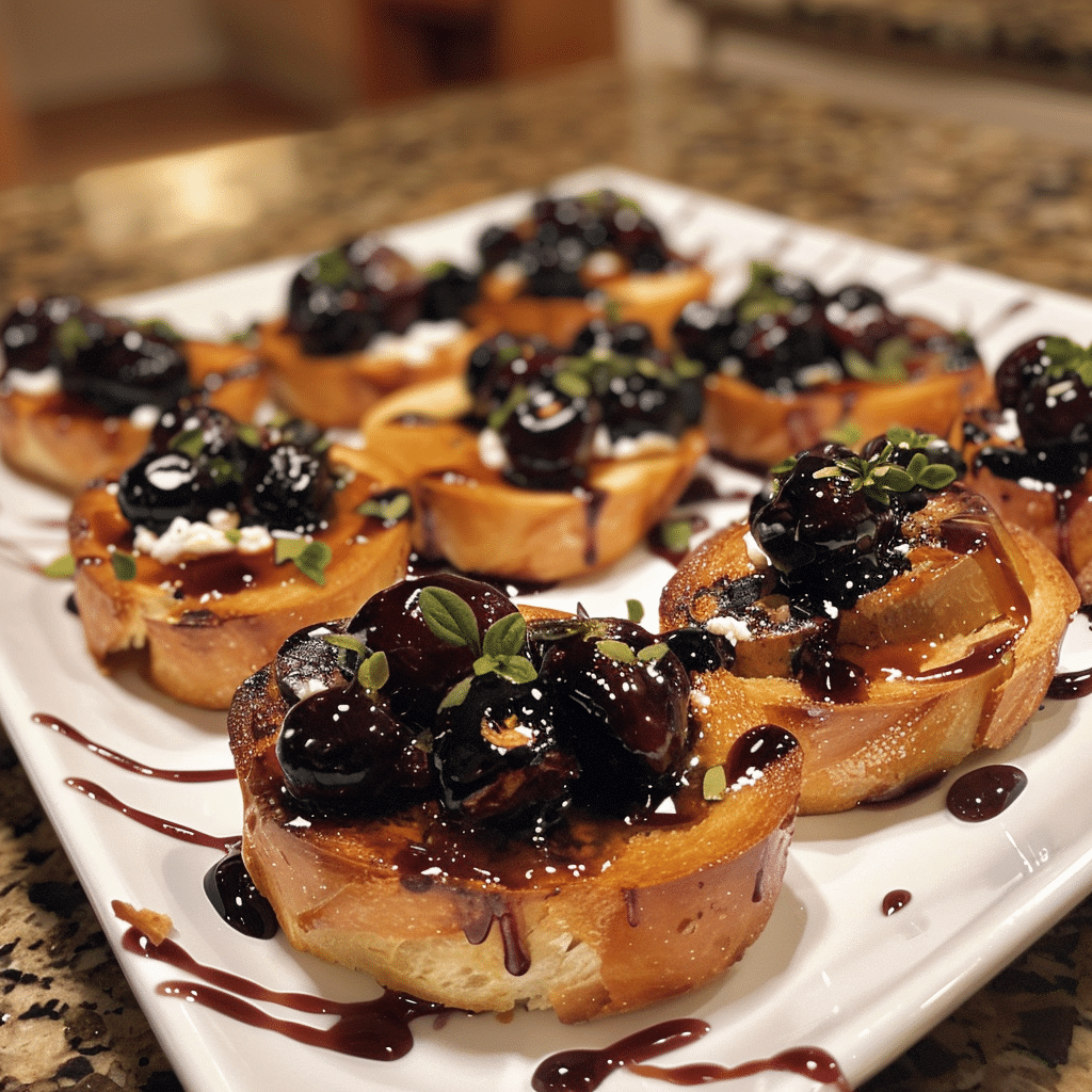 Balsamic Blueberry Goat Cheese Crostinis are a refined yet simple appetizer that perfectly balances sweet, tangy, and creamy flavors. This recipe is ideal for entertaining, whether you are hosting a formal gathering or a relaxed get-together with friends. I first made these crostinis for a small dinner party when I wanted something visually impressive without spending hours in the kitchen, and they were an instant hit. The juicy blueberries simmered in balsamic vinegar create a glossy topping that pairs beautifully with the tangy creaminess of goat cheese. Crisp toasted bread provides the perfect contrast, making every bite layered and satisfying. What I appreciate most about this recipe is its versatility; it works equally well as a starter, a cocktail bite, or part of a larger appetizer spread. Despite their elegant appearance, these crostinis are approachable, quick to prepare, and rely on simple ingredients that shine when combined thoughtfully.