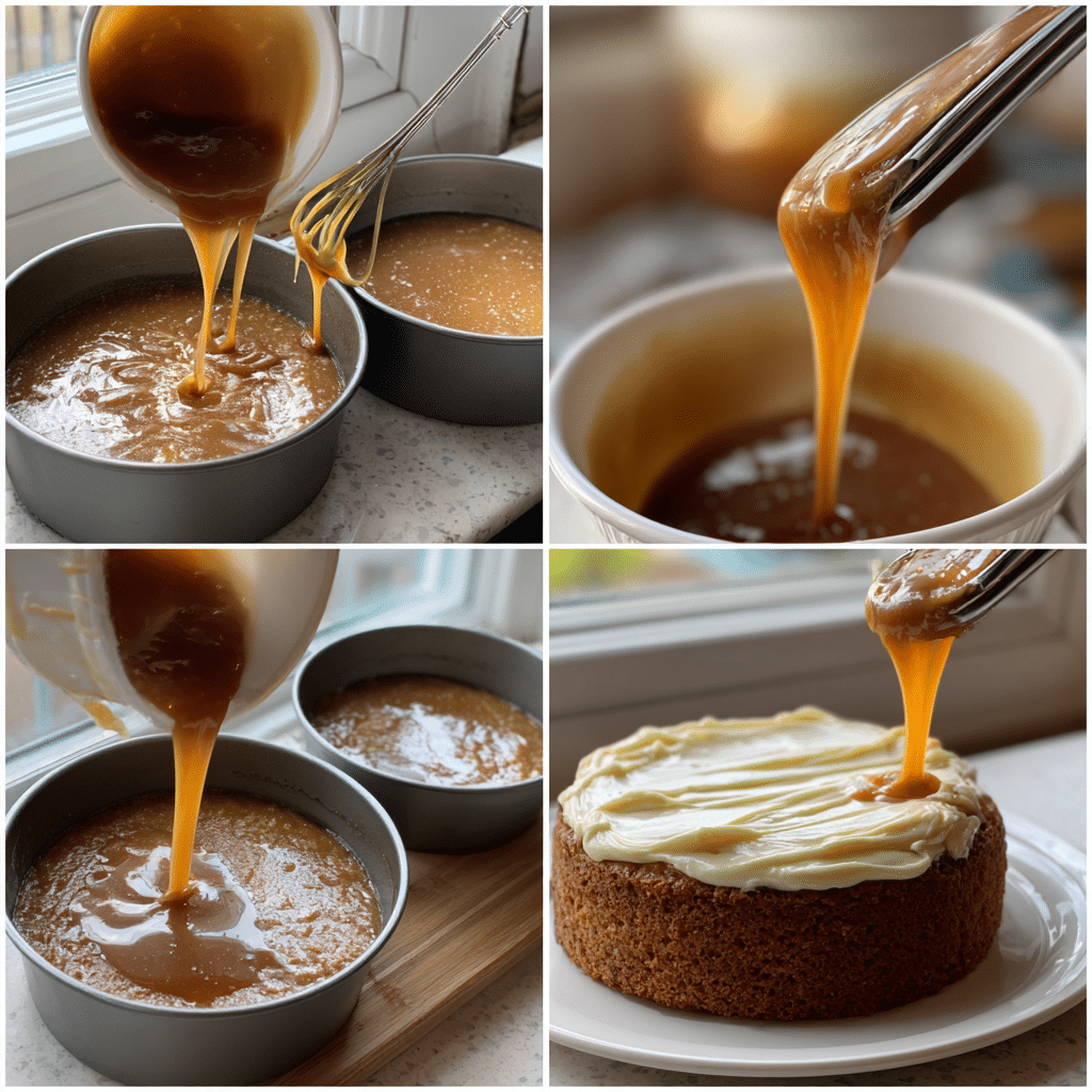 - Make the Caramel Frosting: In a saucepan over medium heat, melt butter and brown sugar together. Stir until bubbly, about 2 minutes. Add heavy cream and whisk until smooth. Remove from heat and cool slightly.