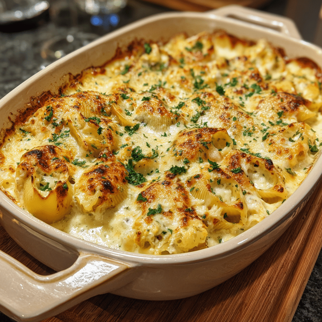 Cheesy Chicken Alfredo Stuffed Shells offer creamy indulgence, tender chicken, and perfectly baked pasta in every bite. This dish transforms classic Alfredo flavors into an impressive yet approachable meal that is ideal for gatherings or comforting family dinners. With simple preparation and adaptable ingredients, it is a recipe that delivers both satisfaction and elegance.