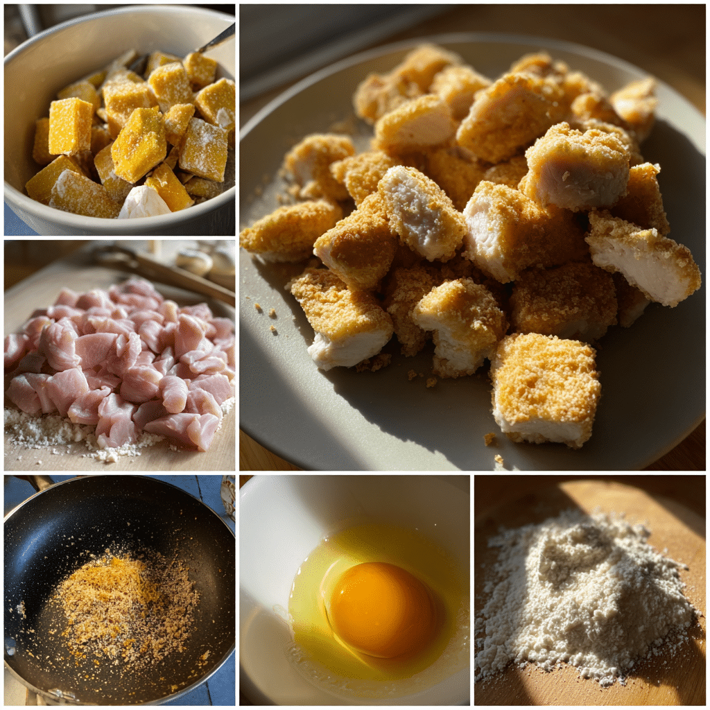 Start by preparing the chicken. Cut the chicken breasts into evenly sized bite-sized pieces so they cook uniformly. Pat them dry with paper towels to remove excess moisture, which helps the coating stick better.