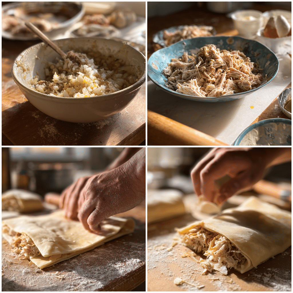 - Place a spoonful of chicken filling in the center of each pastry piece.