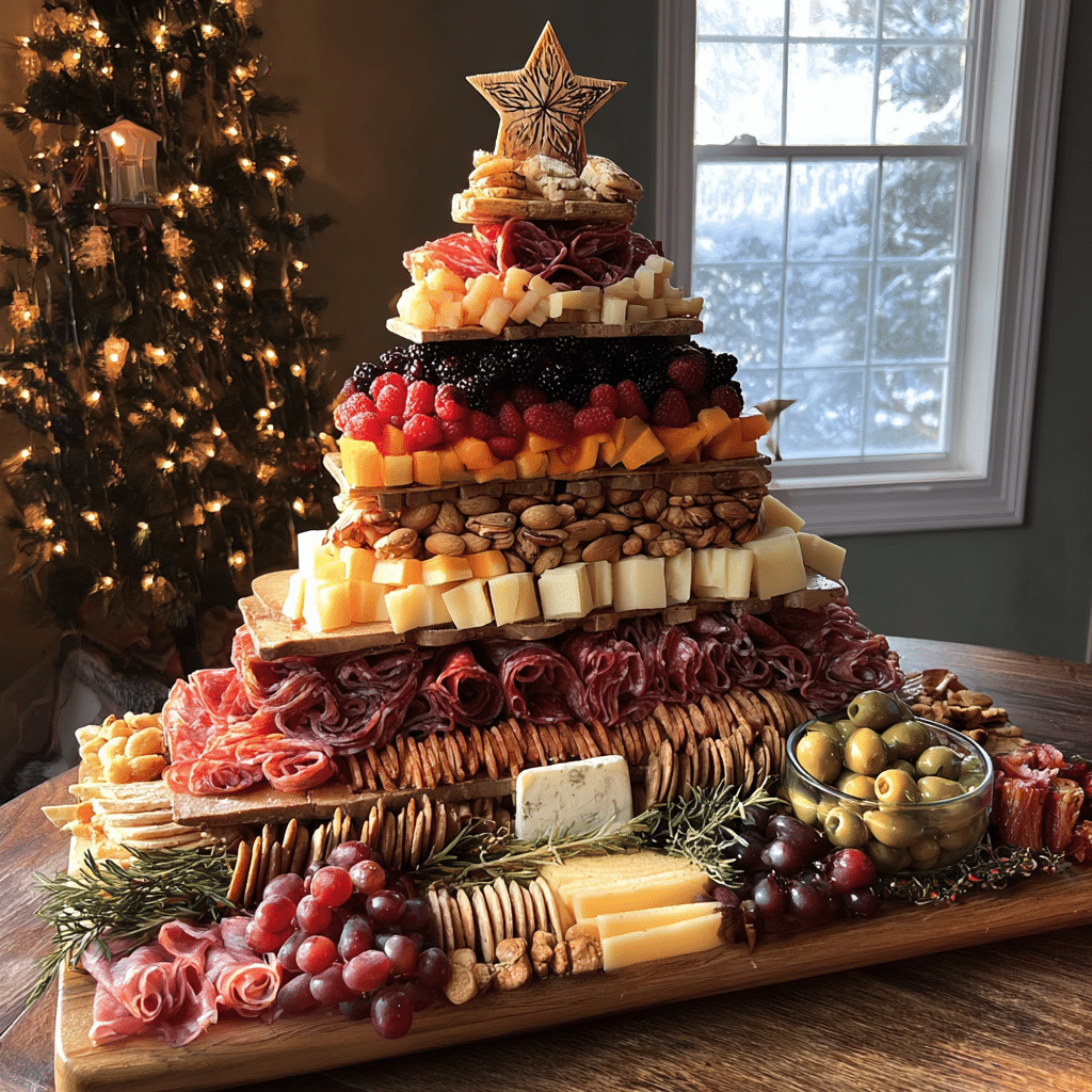 A festive Christmas Tree Charcuterie Board arranged with meats, cheeses, fruits, and garnishes in the shape of a holiday tree—perfect for parties and seasonal gatherings.