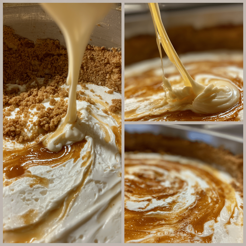 In a separate bowl, mix brown sugar, cinnamon, flour, and melted butter to create the cinnamon swirl mixture. Pour the cheesecake batter over the crust, then spoon the cinnamon mixture over the top. Use a knife to gently swirl it through the batter.