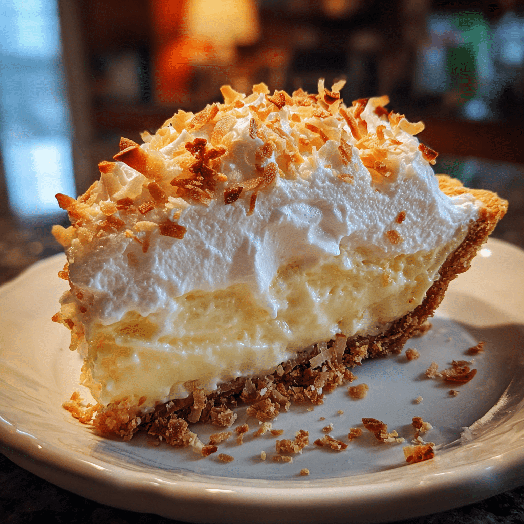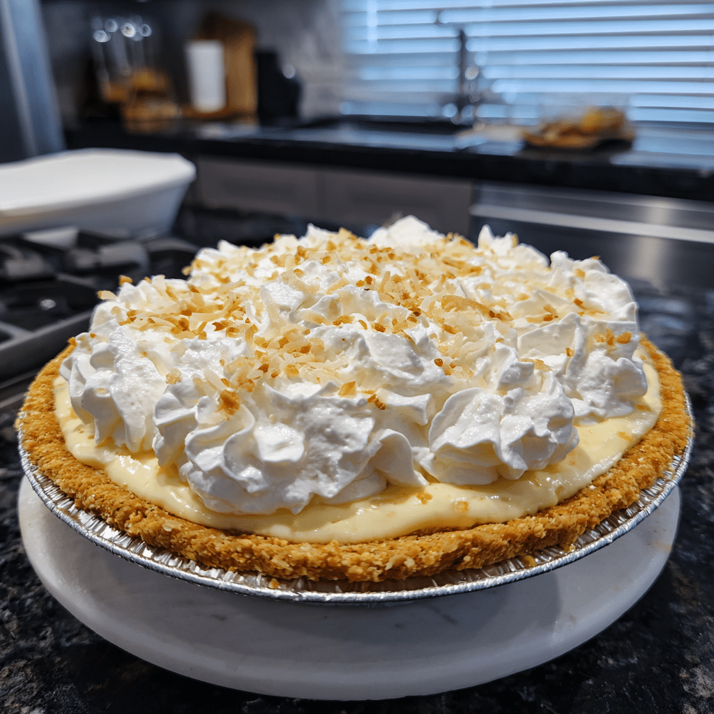 A classic coconut cream pie with a buttery crust, rich coconut custard filling, and fluffy whipped cream topping.