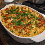 This casserole turns pantry staples into a luxurious, savoury bake that requires minimal effort but delivers maximum comfort. It layers sweet onions, juicy chicken, aromatic herbs, and melty cheese over perfectly cooked orzo, creating a dish that feels rustic, homely, and deeply flavourful.