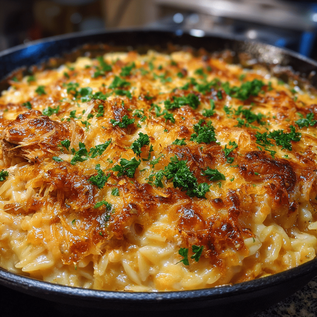 A cozy, savory casserole combining tender chicken, caramelized onions, creamy orzo, and melted cheese—capturing the classic flavors of French onion soup in a hearty baked dish.