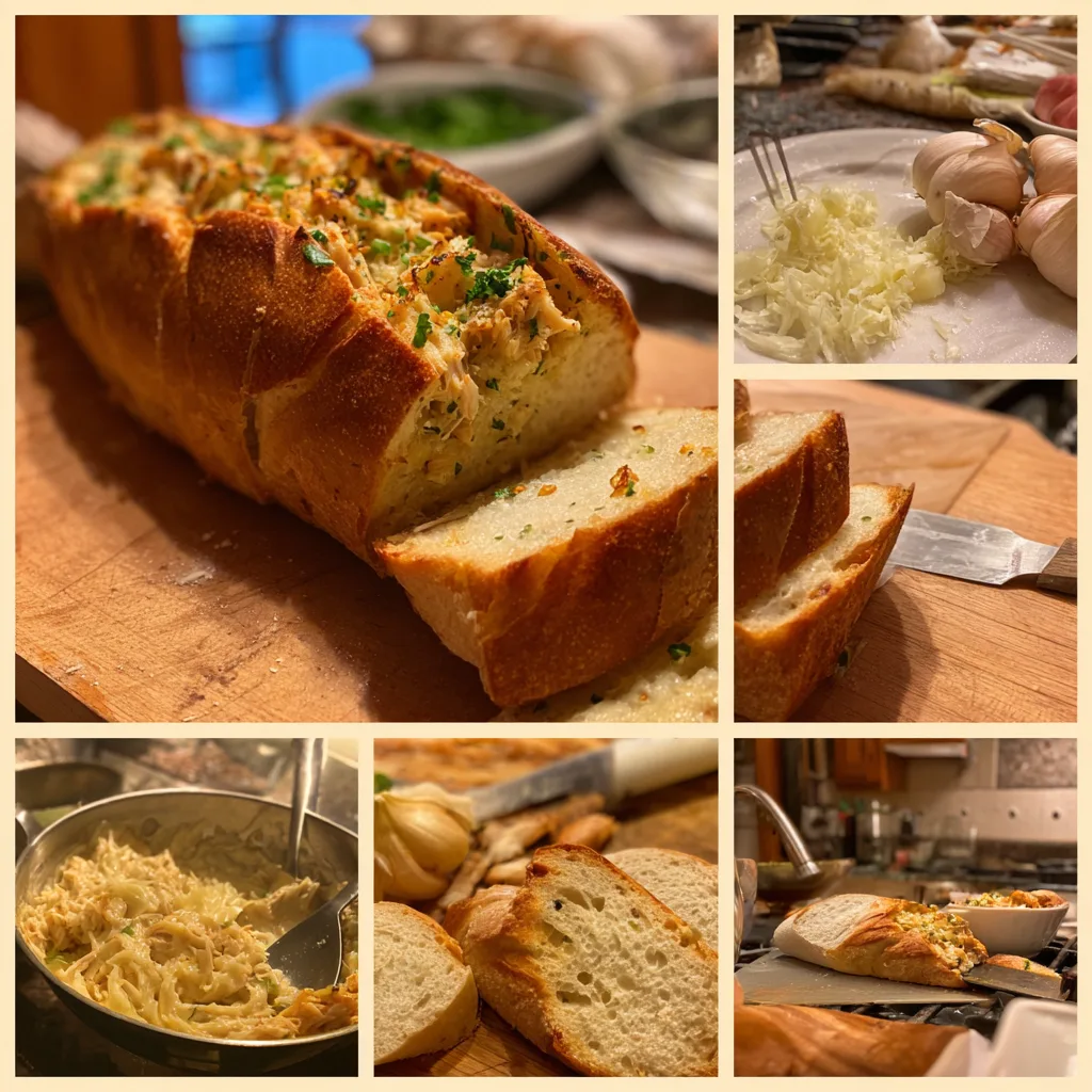 A delicious stuffed garlic bread filled with juicy chicken, melted cheese, and flavorful garlic butter, baked until crispy on the outside and gooey inside.