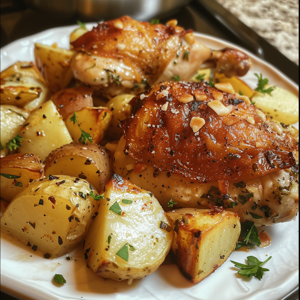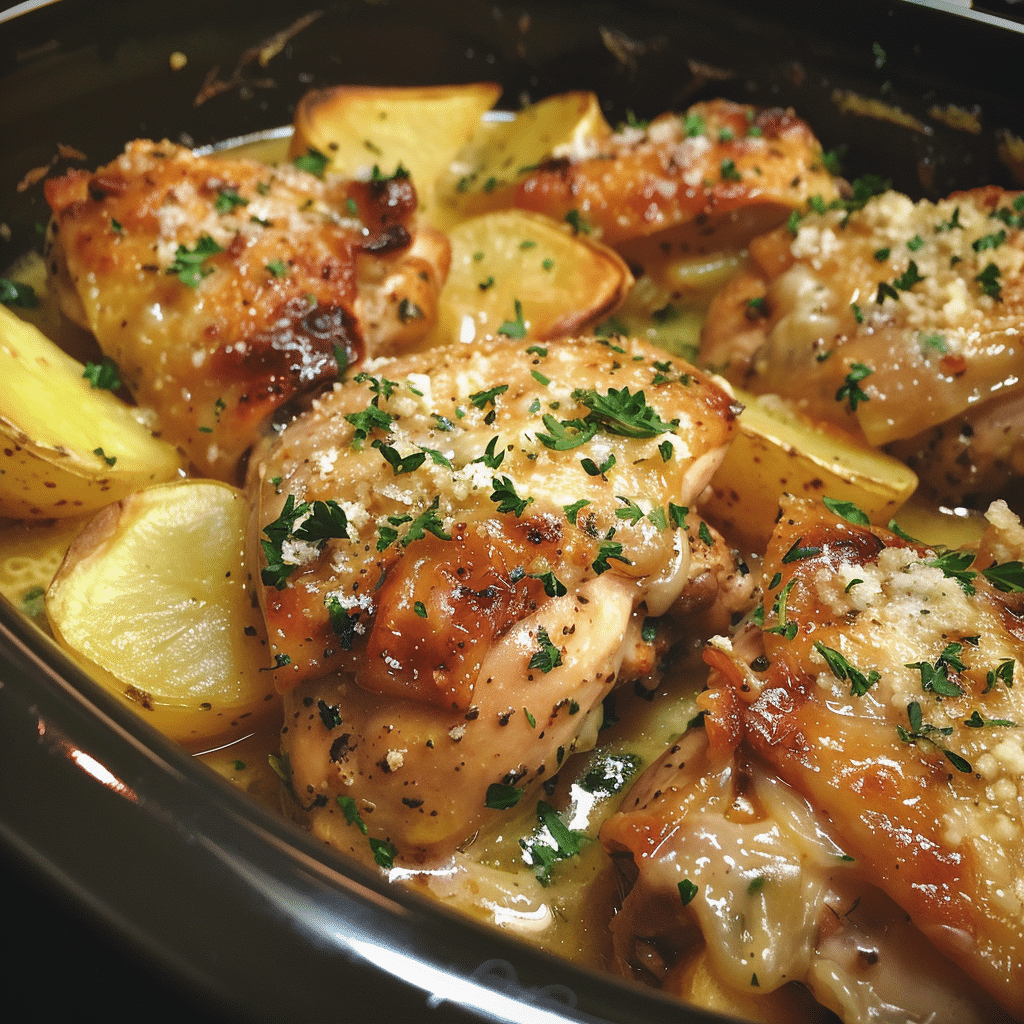 A comforting slow-cooked meal featuring tender chicken and buttery potatoes coated in a rich garlic Parmesan sauce.