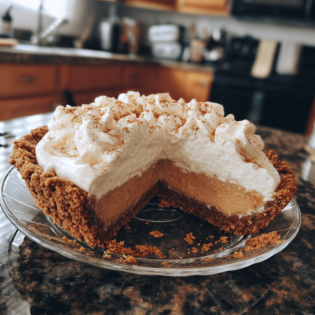 Pour the filling into the chilled crust and smooth the top with a spatula. Refrigerate for at least four hours or until fully set. Once chilled, the pie slices beautifully, maintaining a velvety structure. If desired, garnish with additional whipped cream, crushed cookies, or a light dusting of cinnamon before serving.