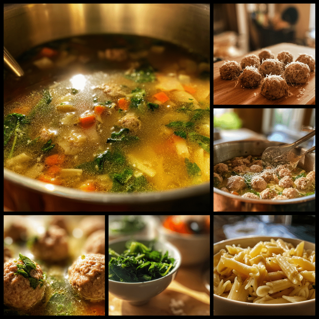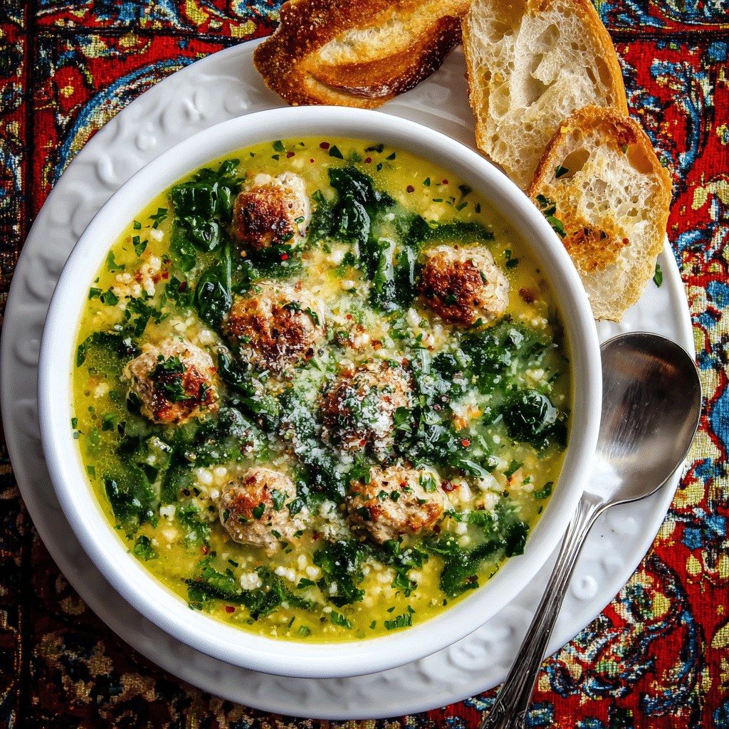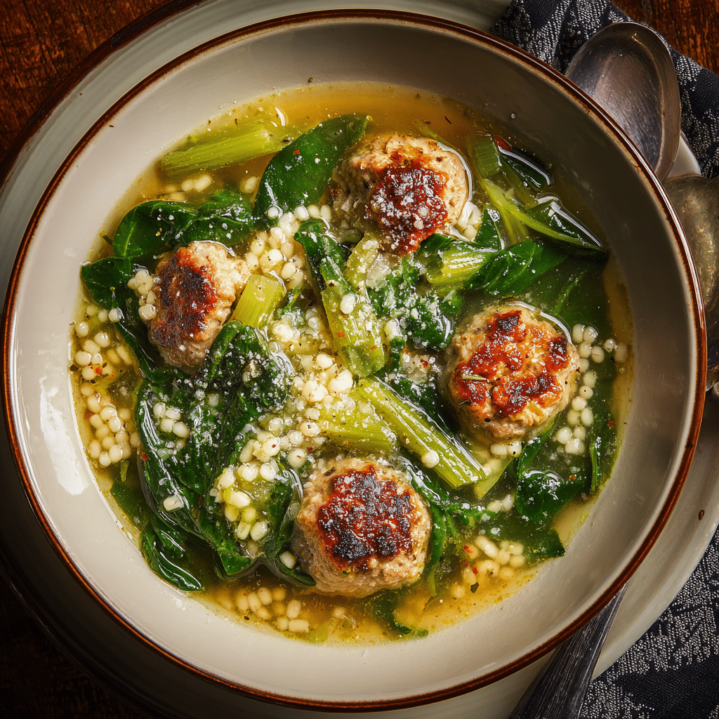 A comforting Italian classic featuring tender meatballs, leafy greens, and small pasta simmered in a flavorful chicken broth.