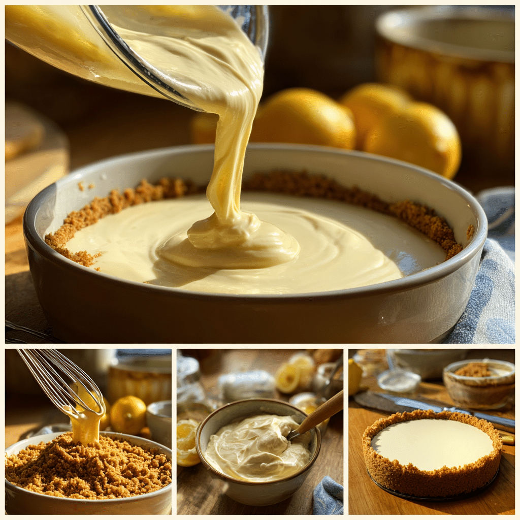 - Pour the lemon cheesecake filling over the chilled crust and smooth the top.