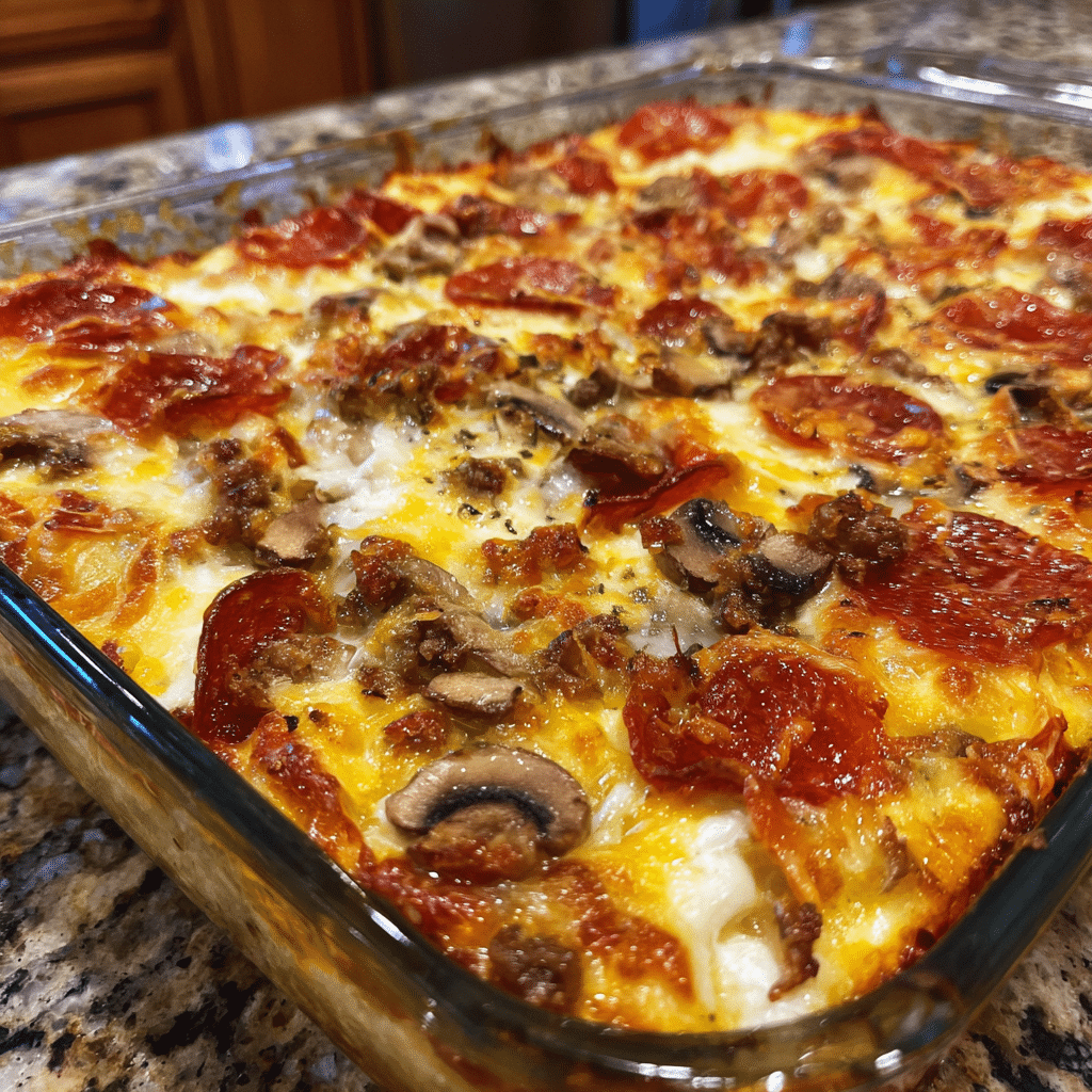Low-Carb Pizza Casserole is a cheesy, hearty dish that delivers all the flavors of classic pizza without the crust—packed with seasoned meat, vegetables, marinara sauce, and plenty of melted cheese.