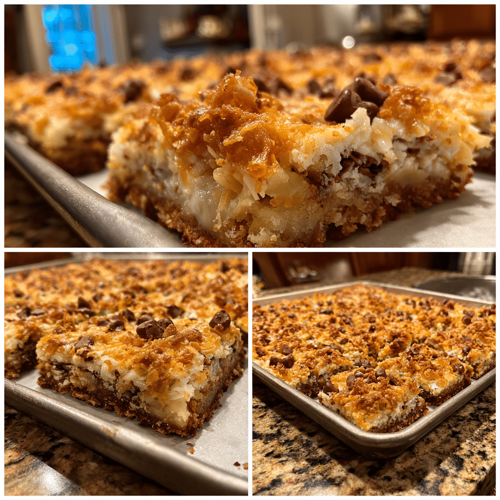They’re layered dessert bars made with a graham cracker crust, condensed milk, chocolate, coconut, and nuts — baked to gooey perfection.