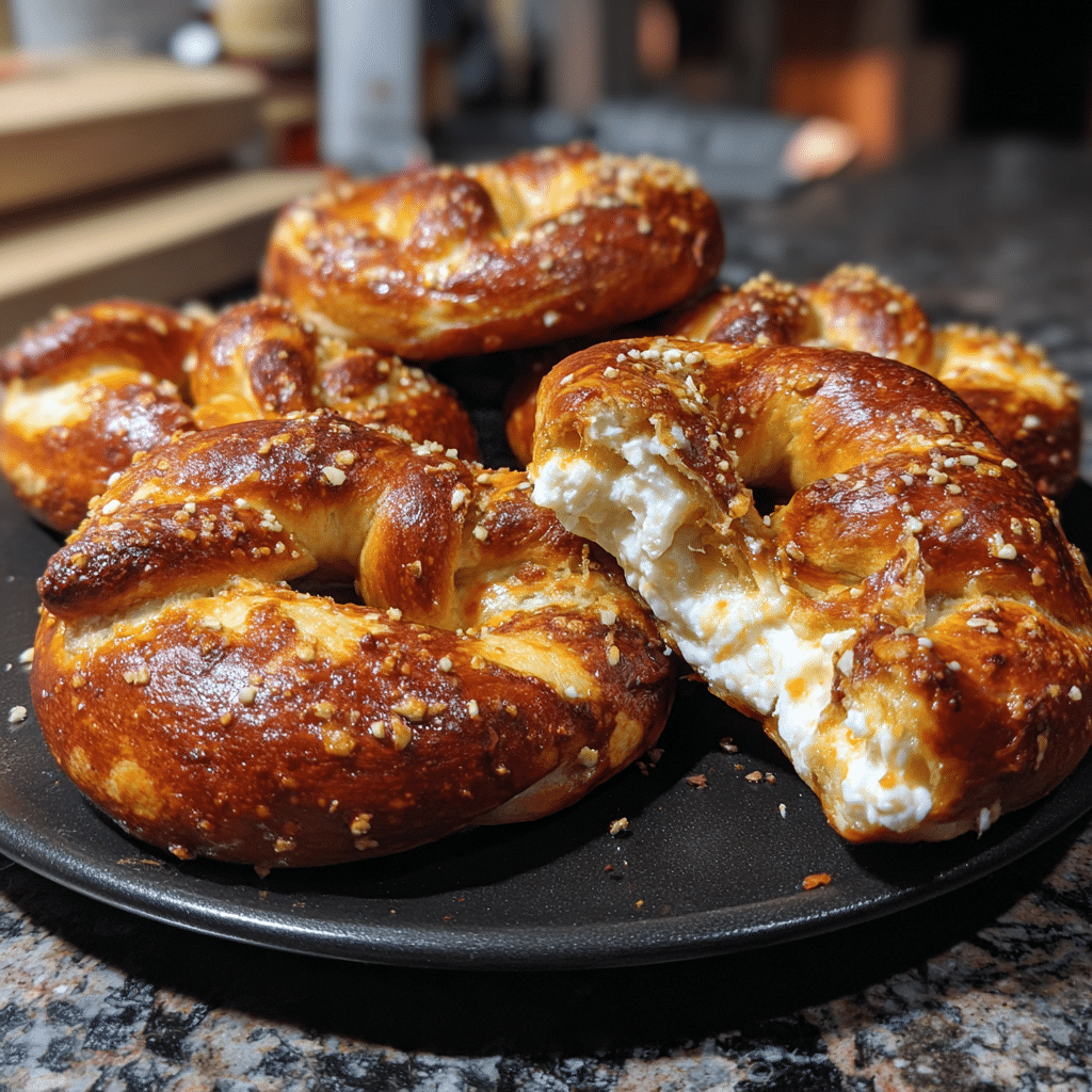 Soft, chewy homemade pretzels stuffed with gooey melted mozzarella cheese, baked to golden perfection and topped with coarse salt. Perfect as a savory snack or appetizer.