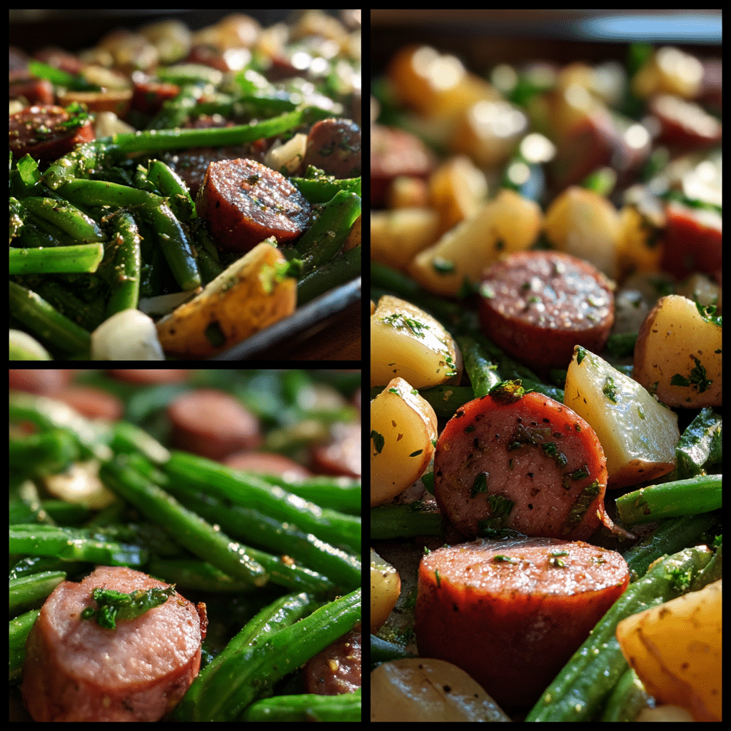 A hearty and flavorful one pan meal featuring roasted sausage, tender green beans, and crispy potatoes seasoned with garlic and herbs for an easy weeknight dinner.