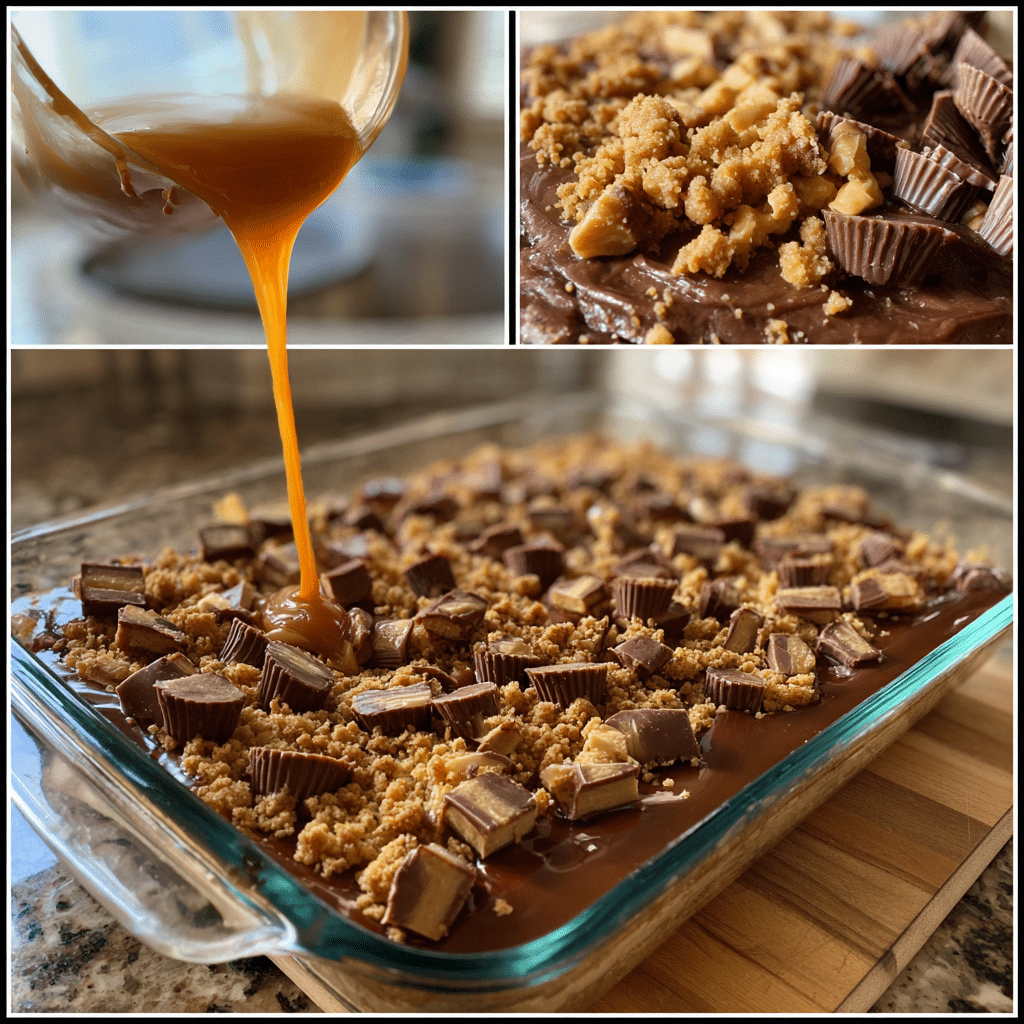 One of the biggest advantages of this recipe is the time-saving method. Instead of preparing a traditional cake batter, you simply layer ingredients in the pan and bake. The result is a soft, chocolatey cake with pockets of melted peanut butter cups that create a luscious texture throughout.