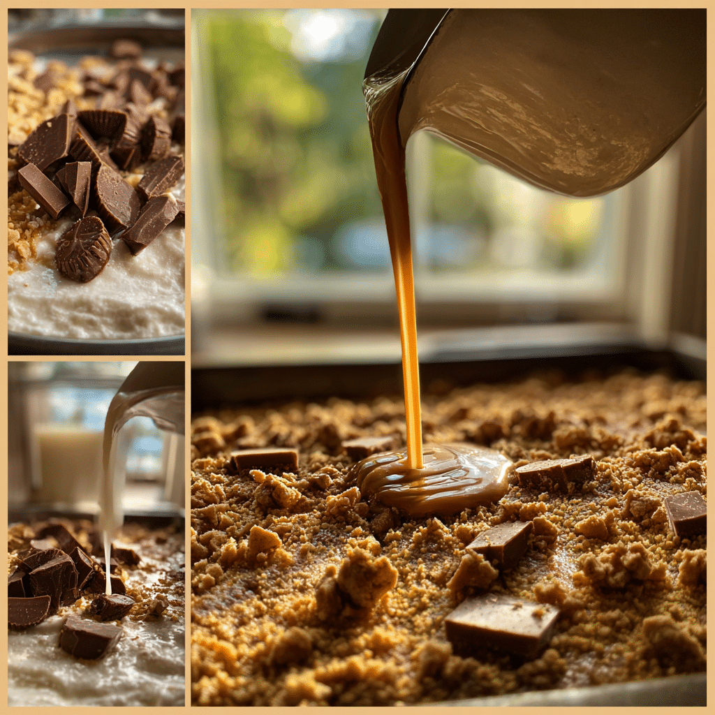 Preheat your oven to 350°F and lightly grease a 9×13-inch baking dish. Spread the chopped peanut butter cups evenly across the bottom of the dish. Drizzle the sweetened condensed milk over the top, ensuring even coverage.