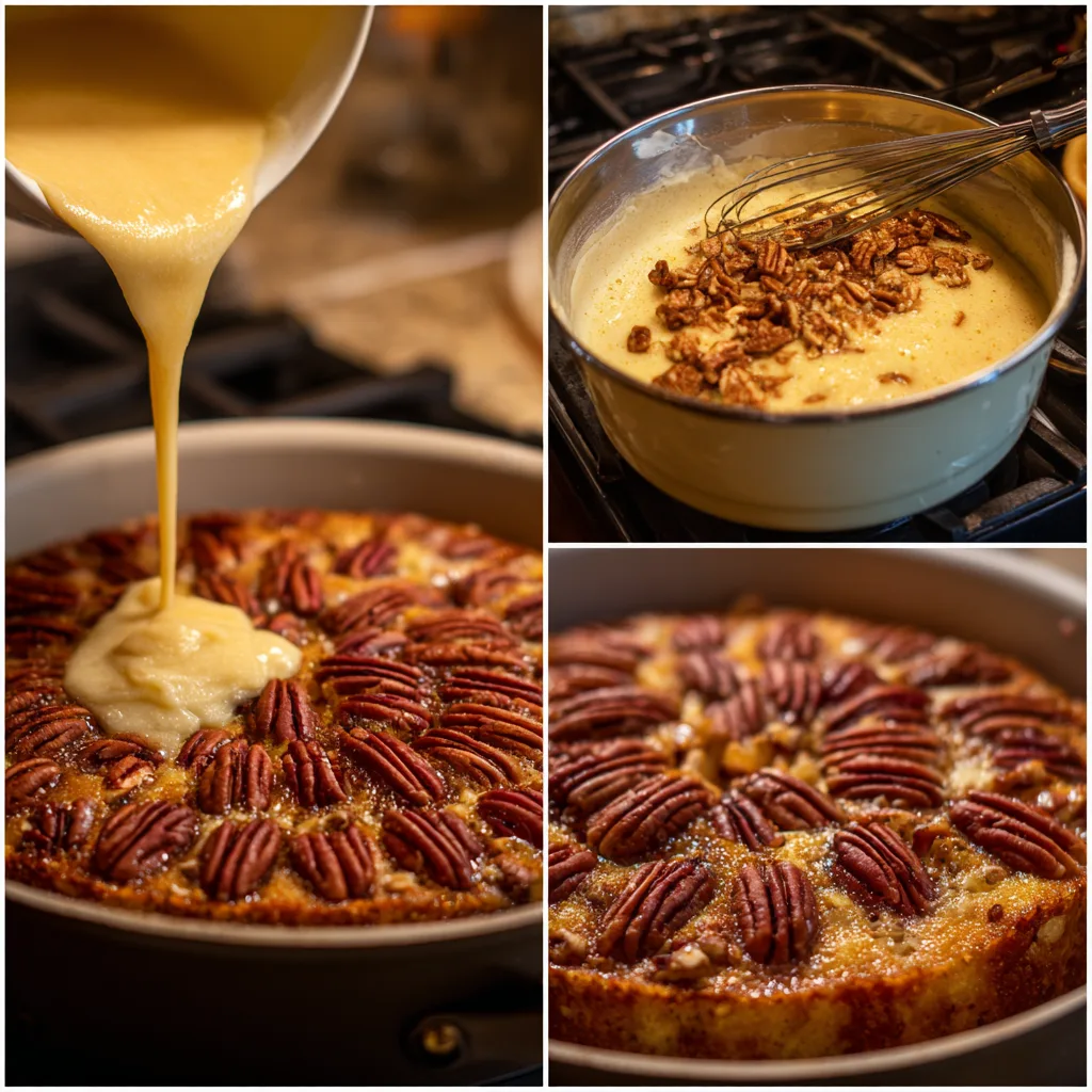 Gradually combine the dry ingredients with the wet mixture, alternating with milk to create a smooth batter. Pour the batter gently over the pecans and spread it evenly without disturbing the topping.