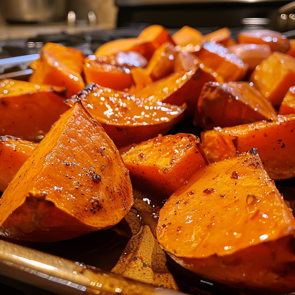 Tender roasted sweet potatoes coated in a caramelized maple glaze, creating a perfect balance of sweetness and warm spices.