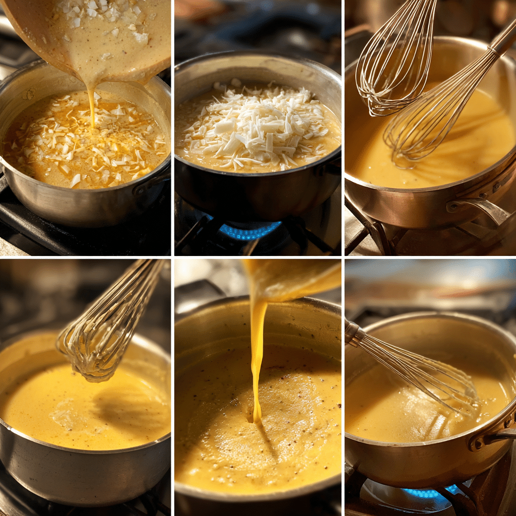 7. Reduce heat to low and add grated cheeses a handful at a time, whisking until fully melted and smooth.