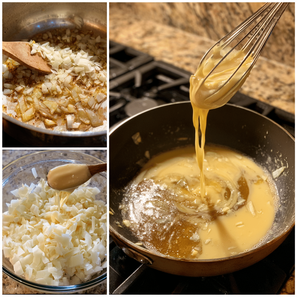 Start by melting butter in a large pot over medium heat. Add diced onion and cook until translucent, then stir in minced garlic and cook briefly until fragrant. Sprinkle flour over the onions and stir to form a roux, cooking for 1–2 minutes.