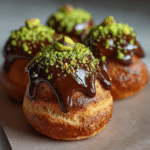 Light and airy choux buns filled with silky pistachio cream and topped with rich chocolate glaze. These elegant pastries combine nutty pistachio flavor with decadent chocolate for the ultimate dessert.