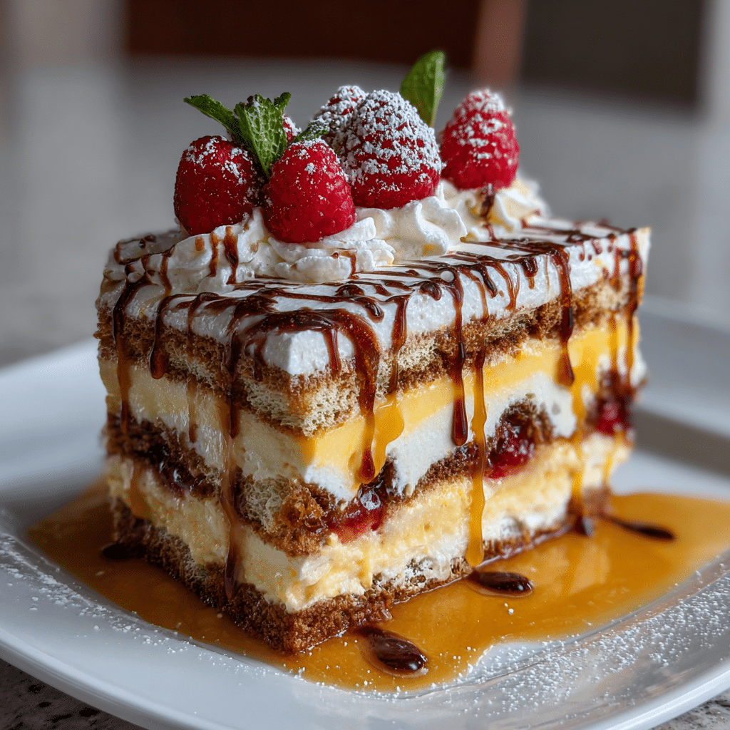 Sponge cake or ladyfingers form the base, absorbing the custard and liqueur beautifully.